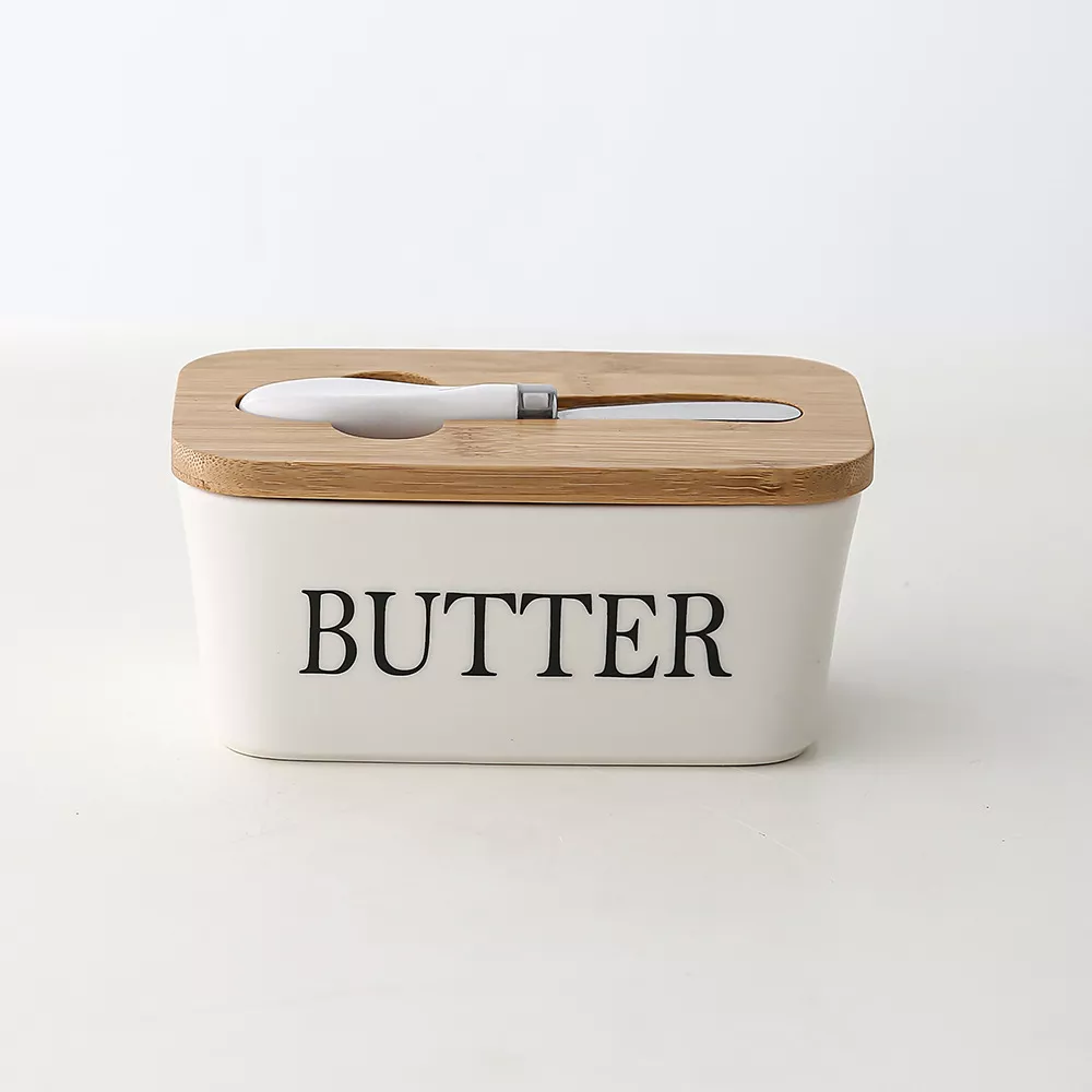 Ceramic Butter Box with Wooden Lid and Knife
